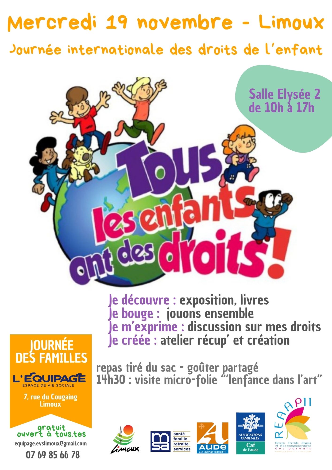 À l’occasion de la Journée internationale des droits de l’enfant, l’Espace de Vie Sociale l’Équipage invite toutes les familles, petits et grands, ainsi que le grand public, à une journée d’animations à Limoux, salle Elysée 2, de 10h à 17h.